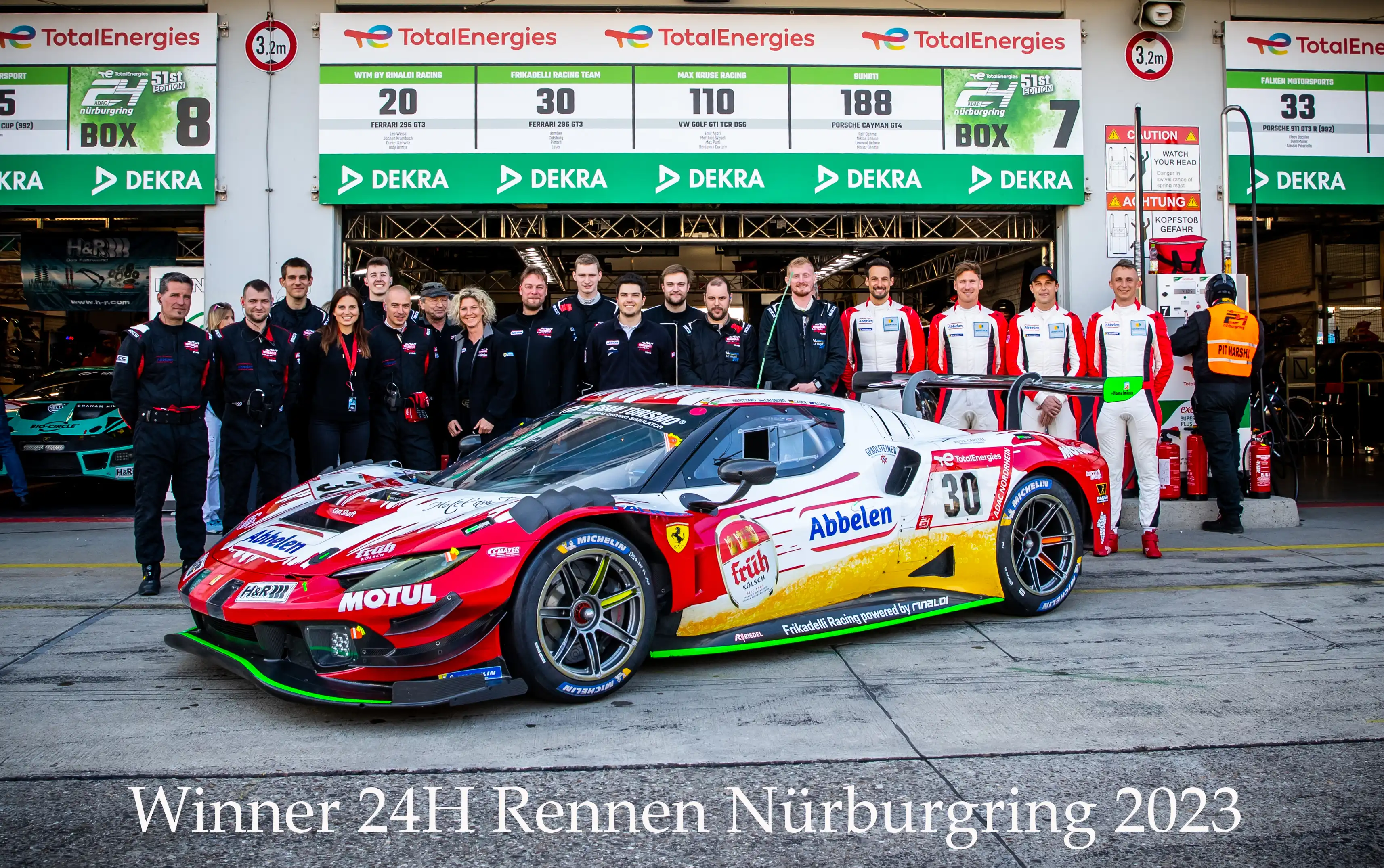 Wenn Leidenschaft, Präzision und Benzin im Blut aufeinandertreffen, sind wir gern mit im Rennen – beim Frikadelli Racing Team. Im Jahr 2005 gründet der gelernte Metzgermeister und Rennsportbegeisterte Klaus Abbelen sein eigenes Motorsportteam. Als Inhaber des gleichnamigen Lebensmittelunternehmens liegt der Spitzname „Frikadelli“ quasi auf der Hand – und der Teamname gleich mit. Von Beginn an mit an Bord: Sabine Schmitz, Partnerin und Teamkollegin von Abbelen. Als „Königin des Nürburgrings“ kennt „Speedbee“ jede Kurve der Nordschleife besser als alle anderen. 2023 schreibt Frikadelli Racing Geschichte: Am 21. Mai gewinnt das Team mit Nick Catsburg, Earl Bamber, David Pittard und Felipe Laser im #30 Ferrari 296 GT3 „Bella“ das legendäre 24h-Rennen auf dem Nürburgring – mit einem Vorsprung von fast 27 Sekunden. Ein Sieg, der in die Rennchronik eingeht – und den wir natürlich standesgemäß mit einem FRÜH gefeiert haben.