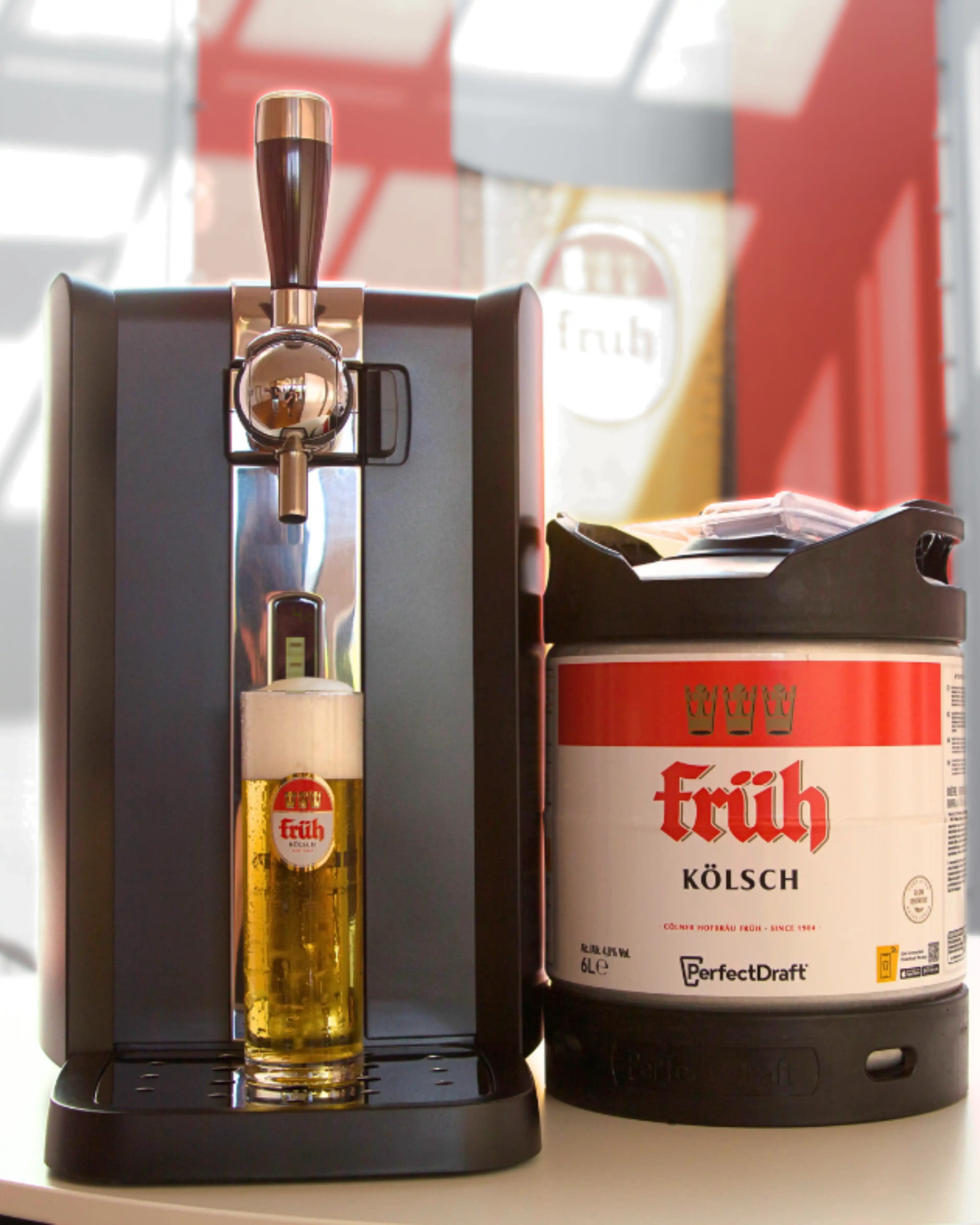 FRÜH ist exklusiver Kölschpartner der Heimzapfanlangen PerfectDraft. Die praktischen 6 Liter-Fässer liefern bis zu 30 Tage lang frisch gezapften Kölschgenuss direkt zuhause und in Lieblingstrinktemperatur. Das System überzeugt durch seine Einfachheit: die Fässer werden lediglich an die Anlage angeschlossen, loszapfen und anstoßen.