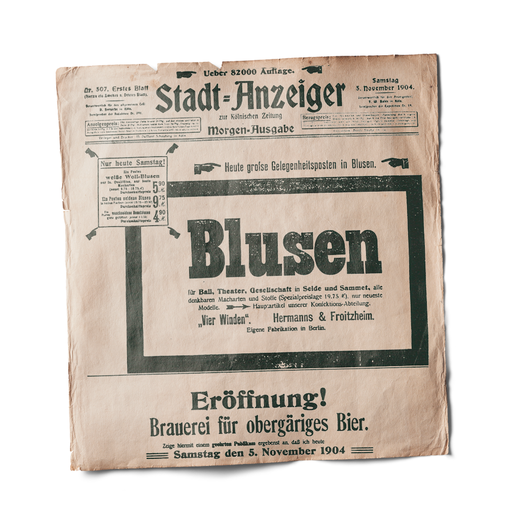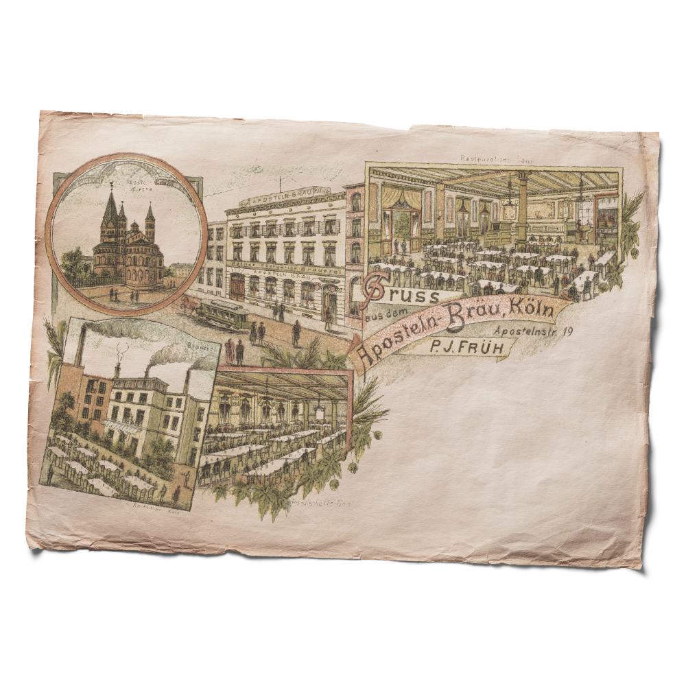 In der Apostelnstraße 19. Peter Josef Früh gründet das Aposteln-Bräu – mit einem genehmigten Dampfkessel, aber ohne Ausschankkonzession. Die Stadt Köln sieht „keinen Bedarf“. Früh sieht das anders – und gibt nicht auf. Wenig später läuft das Geschäft, und das Aposteln-Bräu wird zum beliebten Treffpunkt.